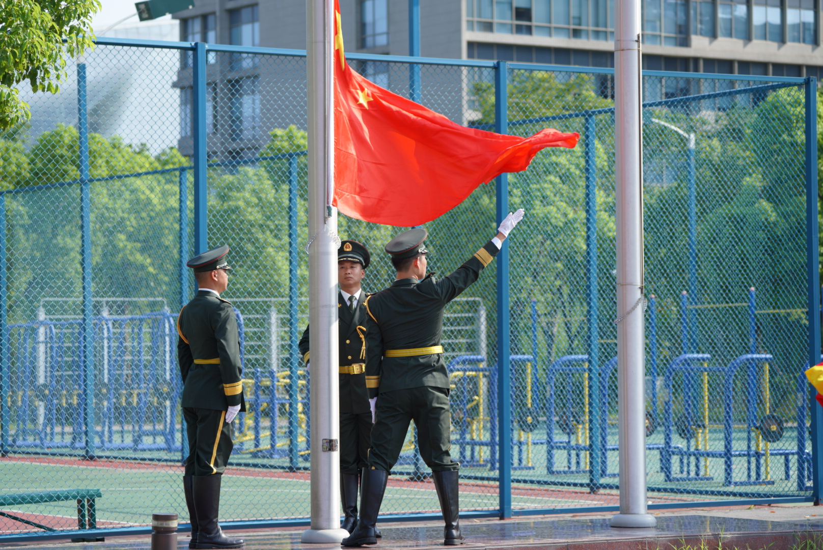 在庄严的乐声中,护旗手们迈着矫健的步伐,护送国旗走过鲜红的跑道俨然仿似中华民族走过千万烈士用热血染就的革命历程,走过过去干戈扰攘的萧索岁月,走上未来灿烂繁荣的康庄大道。当嘹亮的国歌响起,大家怀着热血贲张的激情与拳拳爱国之心,唱出每一句歌词,铿锵有力、掷地有声。千道目光汇聚的中心,五星红旗在风的引领下自由招展,和东方的灿阳一同冉冉升起,将光辉照耀进每个人的心间。