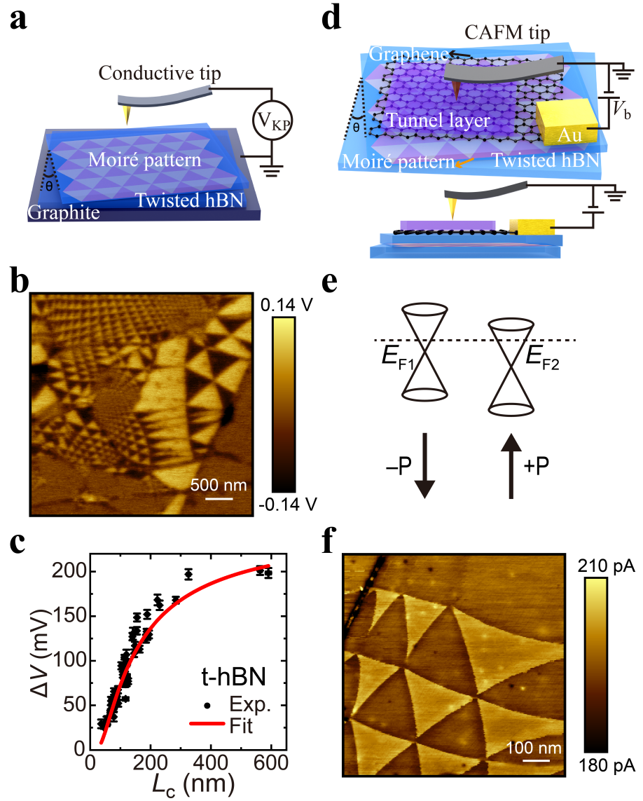 利用这一手段,研究人员发现对于从百纳米到数纳米级别的moiré畴,其moiré铁电势场的强度都维持稳定(如图二b和c所示)。而与之对照,用传统方法得到的电势场高度依赖于moiré畴的尺寸。这一结果有利于澄清在该问题上存在的争议,并对进一步利用该铁电势场提供了有益的指导。