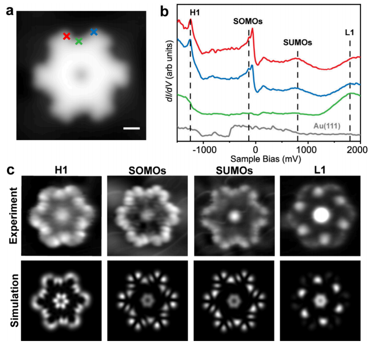 研究团队利用扫描隧道谱(STS)研究冠状分子的电子结构与自旋性质。如图2所示,冠状石墨烯dI/dV谱在-1240和1880 mV处呈现对应多个占据态H1和未占据态L1的电子态,而-125和860mV的电子态来源于分子的单占据和单未占据分子轨道(SOMO和SUMO)。团队引用平均场(MFH)模型计算得到分子轨道态密度分布,计算结果与对应能量下扫描的dI/dV图高度吻合,进一步证实了电子态的轨道来源。