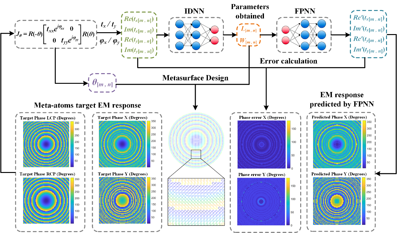 超表面凭借对亚波长尺度“超原子”结构几何形态的精细设计,能够在超薄二维平台上实现对电磁波振幅、相位及偏振态的灵活调控,在未来光子系统中展现出巨大的应用潜力。但当前超表面设计仍依赖传统“自下而上”的参数扫描与经验,在面对多自由度控制、超大规模阵列设计以及复杂偏振态调控等高需求场景时,仅凭经验设计效率低下、计算资源消耗巨大,还面临结构参数与电磁响应之间的非唯一映射问题,严重制约了超原子结构参数设计的稳定性和可控性。近年来,人工神经网络的发展为超表面的逆向设计提供了全新范式,使得高像素、复杂结构超表面的快速设计成为可能。因此,采用神经网络的逆向设计方法,对于提升太赫兹超表面的多功能集成能力、突破其偏振控制与效率瓶颈,实现高精度、实时可重构的新型光学器件,具有重要的意义与应用价值。