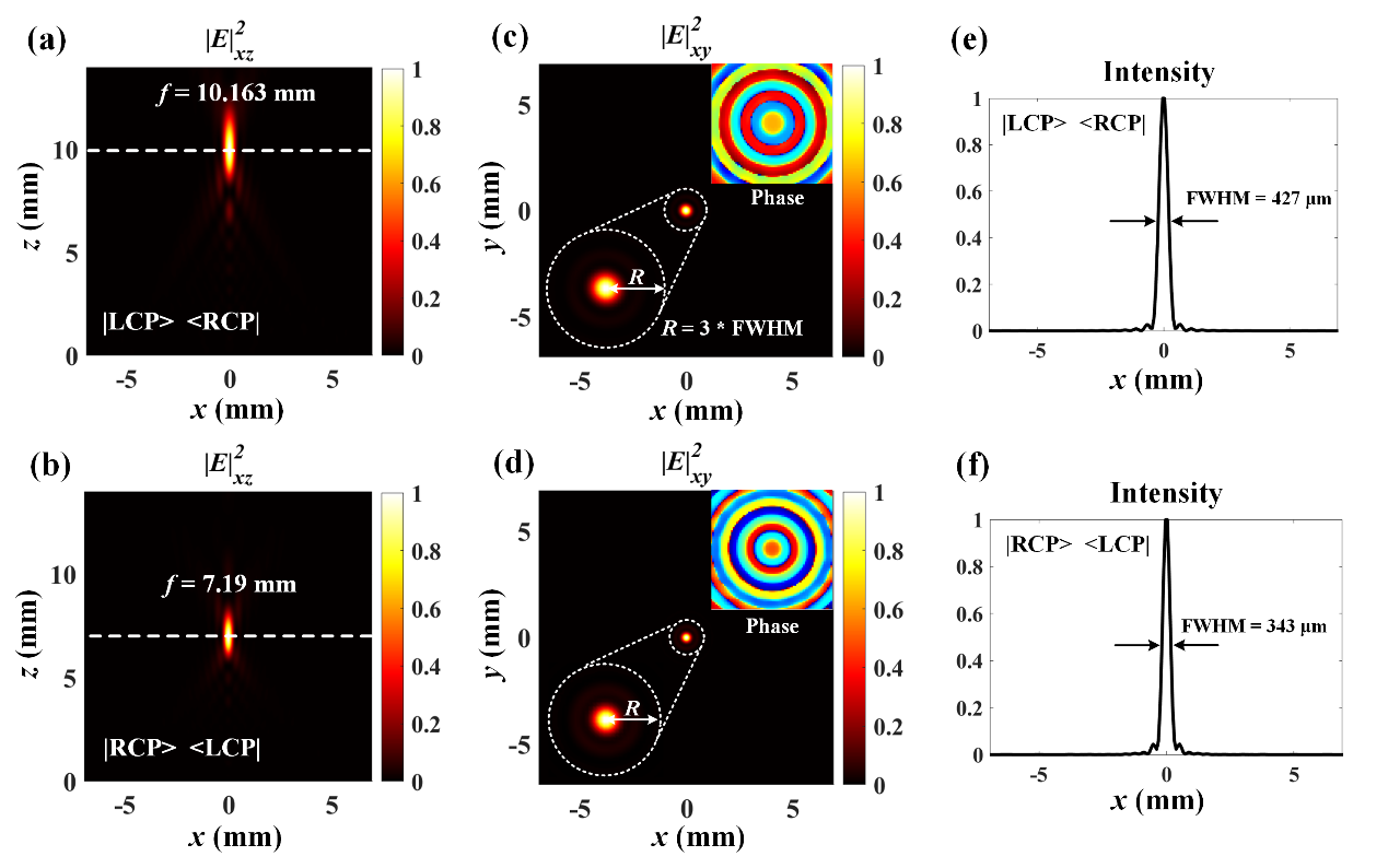 图3 在左旋圆偏振和右旋圆偏振光垂直入射下设计的中心聚焦超透镜
