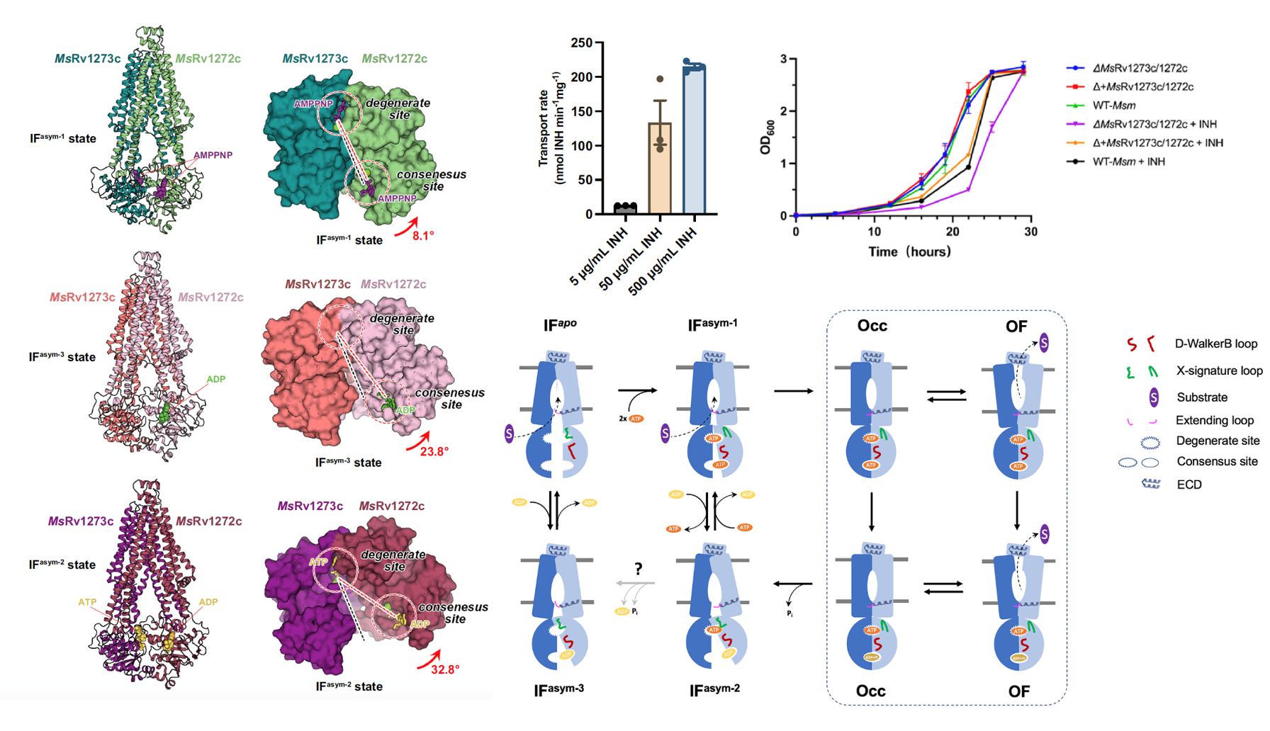 图注:分枝杆菌MsRv1273c/72c的三种不对称中间态结构(左)、异烟肼转运实验(中上),敲除/回补-生长实验(右上),和底物转运机制图(右下)