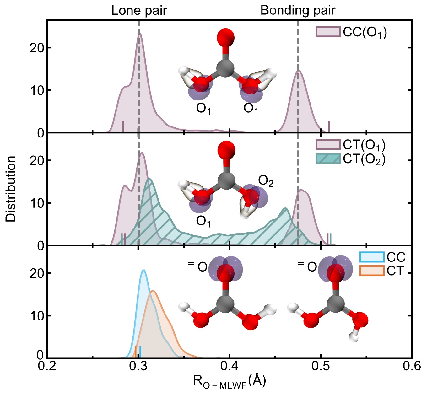 碳酸作为生物体液和海洋环境中的核心质子缓冲剂,通过CC、CT、TT三种构象的动态平衡调控酸碱平衡。虽然以往研究对气相下顺式-顺式(CC)构象的稳定性优势已经达成共识,但对水溶液中构象的稳定性顺序仍长期存在争议。同时,科学界对于多元弱酸解离过程的微观机制仍然缺乏深入认识。孙兆茹课题组硕士生赵曰奇创新性地采用深度势能分子动力学方法模拟了碳酸在百纳秒尺度的解离过程,通过对比气相与液相的电子结构及氢键拓扑网络,取得了突破性发现。