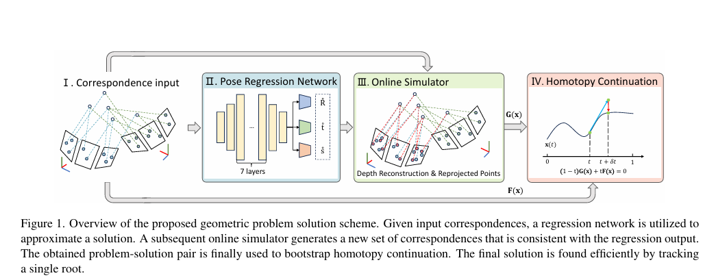 本研究提出一种基于点对应关系的几何问题求解的新范式,巧妙结合了回归网络、在线对应模拟器和同伦延续三个阶段。回归网络充当通用解近似器,仅需在模拟环境中进行训练。虽然单纯的回归精度往往不足以单独解决问题,但本研究结果表明,其精度通常仍足以模拟出一致的起始问题- 解对,从而成功实现单解延续。