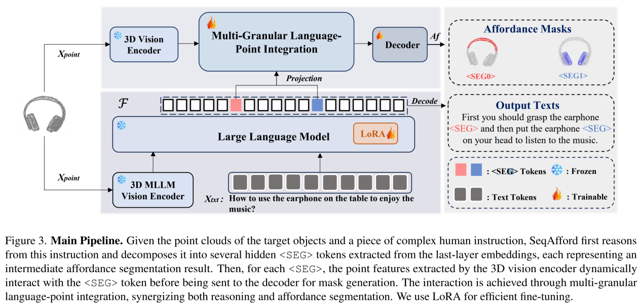 一个先进的可供性(affordances)分割模型不仅要能理解单个物体的单一功能,还要能够处理复杂的、多步骤的用户指令,识别出一系列的affordance区域。针对这一挑战,本工作提出一种全新的序列化3D affordance推理任务,并开发了SeqAfford模型。SeqAfford基于大规模3D多模态大语言模型(MLLM),能够将复杂的用户指令分解为一系列的affordance分割任务,将语言模型的推理结果与3D点云数据有效结合。在大规模基准测试中,SeqAfford在单affordance和序列化affordance推理任务上均显著优于现有方法,展现了其在开放世界环境中的泛化能力和推理能力。
