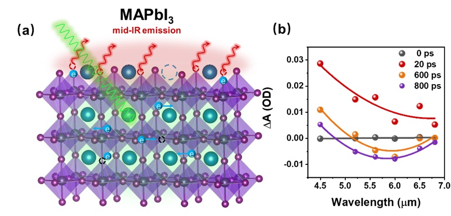 图1 (a) MAPbI3表面中红外发射缺陷态示意图; (b)不同时间延迟下的瞬态中红外光谱