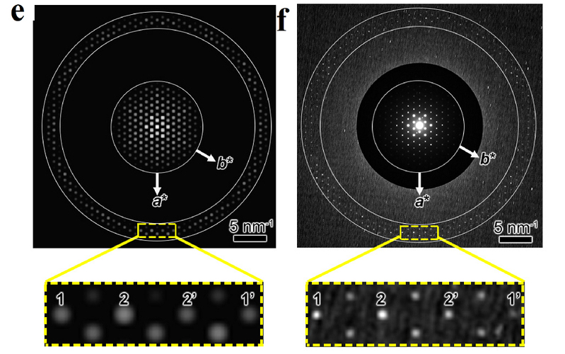 HRTEM images of a chiral zeolite along (a) [2-1-10] and (b) [1-100] zone axes (c) and (d) are processed images from (a) and (b) after Fourier filtering. A simulated (e) and an experimental (f) PED pattern of a chiral zeolite (P6122) along [0001].