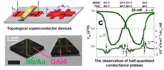 It was only until recently that condensed-matter physicists proposed an alternative approach to design artificial quasi-particles which can mimic Majorana fermions’ behaviors. Specifically, it was predicted that the so-called topological superconducting state (TSC) could be realized in a hybrid system consisting of topological insulators and superconductors, and the collective electrons would behave exactly like Majorana fermions. Following such theoretical work, the team led by Professor Kang L. Wang successfully prepared high-quality magnetic topological insulator-Nb heterostructure devices by using molecular beam epitaxy (MBE). After structural engineering and optimization of the devices, both quantum anomalous Hall (QAH) state and superconducting state were realized simultaneously, which in turn gave rise to the exotic chiral TSC state. Most importantly, by manipulating the external magnetic field (up to ±0.3T), a half-quantized conductance plateau of 0.5e2/h was observed experimentally for the first time, which offered clear evidence for chiral Majorana fermion modes in 1D space.