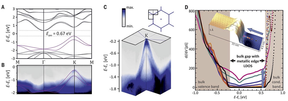 Fig. 2: (A) The theoretically predicted valence band splitting and the 1-dimensional edge states were nicely observed experimentally in (B, C) ARPES and (D) STM.