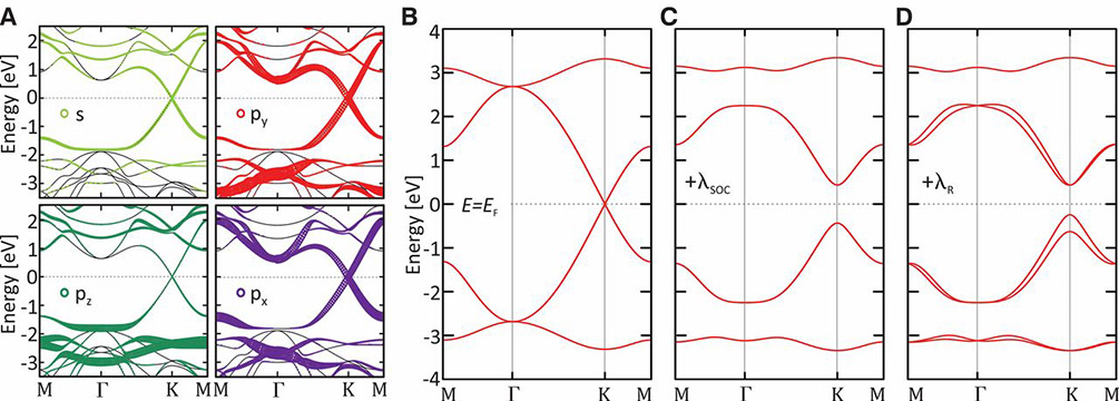 Fig. 3: (A) The Fermi surface of bismuthene consists mainly of Bi-pxand Bi-pyorbitals, based on which an effective model can nicely explain (B) the Dirac linear band crossing in the presence of no SOC; (C) the large topological gap induced by the onsite SOC; (D) and the valence band splitting caused by the Rashba term.