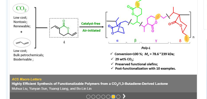 Polymeric materials based on petroleum industry are one of the most important material foundations of modern socio-economy. Five of the current “big six” synthetic polymers are made from olefins via C-C bond formations. Developing sustainable alternatives represents a major challenge in current polymer industry. CO2 is a highly attractive renewable C1 chemical feedstock, due to its abundance, availability, recyclability, and non-toxicity. Making polymers from CO2 , especially copolymerization of COand olefins, has been long sought by numerous polymer chemists.As one of the important components in the C4 fraction of oil cracking, 1,3-butadiene can also be derived from succinic acid, which is ranked as one of the top 12 biomass platform compounds best suited to replace petrochemicals. Thus, chemistry leading to polymers made from CO2 and large-volume dienes, especially 1,3-butadiene, is of significant fundamental interest and promising large-scale industrial utility. 1,3-Butadiene could react with COto produce a lactone efficiently via C-C bond coupling. Polymerization of the lactone has long been considered as one of the most promising avenues to make copolymers from CO2 and olefins. Though researchers tried the polymerization of the lactone about twenty years ago, only one success has been achieved with relatively low conversions under the assistance of metal additives and complex radical initiators. Lin’s research group developed an additive/solvent-free bulk polymerization method, leading to a quantitative monomer conversion (up to 100%) and polymers with molar mass up to 239 kDa as well as high contents of CO2 (29 wt %) and preserved functional olefins of the obtained polymer (poly-L). Through detailed mechanistic studies, it was found that oxygen, commonly considered as a radical inhibitor, acted as an initiator in the system. Possible initiation mechanisms were proposed based on the unique polymer structure.