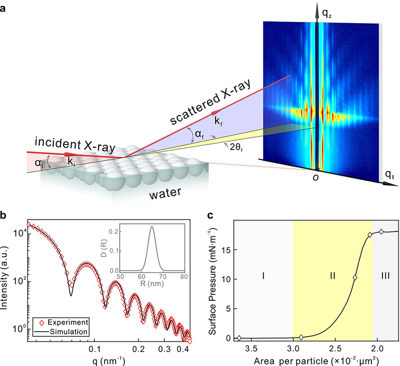 In this work, Professor Chen and his team report the in situ grazing-incidence small-angle X-ray scattering (GISAXS) study of the real-time self-assembly process of polystyrene nanospheres on the air/water interface of a Langmuir-Blodgett (LB) trough. This approach allows for simultaneous monitoring of the in-plane ordering and crystallization and the out-of-plane immersion depth (or contact angle) variation, providing a complete picture of the interfacial colloidal self-assembly process. Upon compression, multiple metastable intermediate states are observed before the stable 2D hexagonal close-packed superlattice monolayer forms under van der Waals attraction. Surprisingly, the immersion depth of the colloidal particles is found to vary with the interparticle distance. Numerical simulations demonstrate that the out-of-plane component of the electrostatic force from neighboring particles increases as the interparticle distance decreases. Such a force presses the particle into water, which deforms the interface and induces the long-ranged capillary attraction. This new finding provides an important clue to the long-standing mystery of the attractive interaction between like-charged particles.