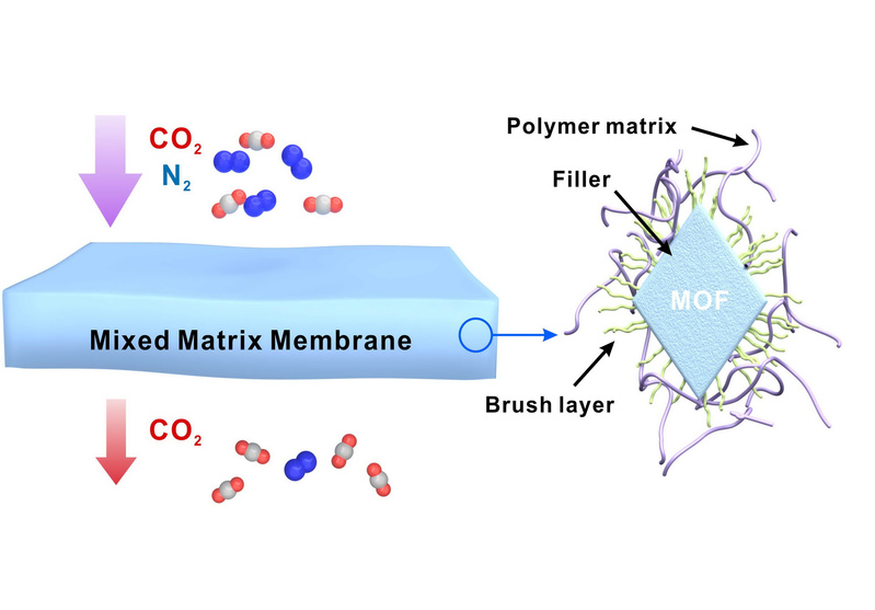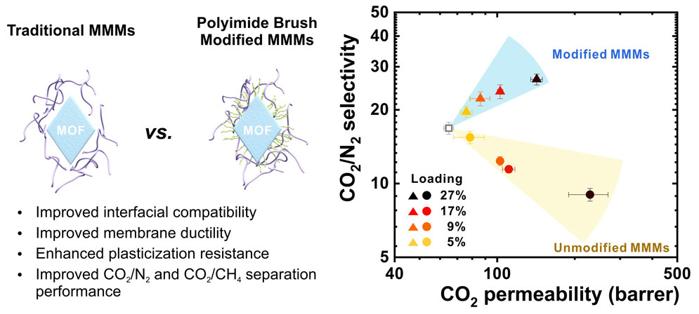 When polymeric membranes are used for CO2 separation under high pressure, they often suffer a loss of selectivity due to enhanced polymer chain mobility induced by CO2 dissolution, a phenomenon known as “plasticization.” Owing to the interpenetration between the PI brushes on the MOF surface and the matrix polymer chains, the resulting membranes exhibit significantly reduced chain mobility, as evidenced by dynamic mechanical analysis and rheology. As a result, these membranes exhibit significantly enhanced plasticization resistance towards CO2, thereby showing great potential for high-pressure CO2 recovery. Meanwhile, the CO2/N2 and CO2/CH4 separation performance of the modified membranes exhibit simultaneous increase of selectivity and permeability, approaching the ideal MMM performance. This work paves the way for the rational design of high-performance MMMs for gas separation.