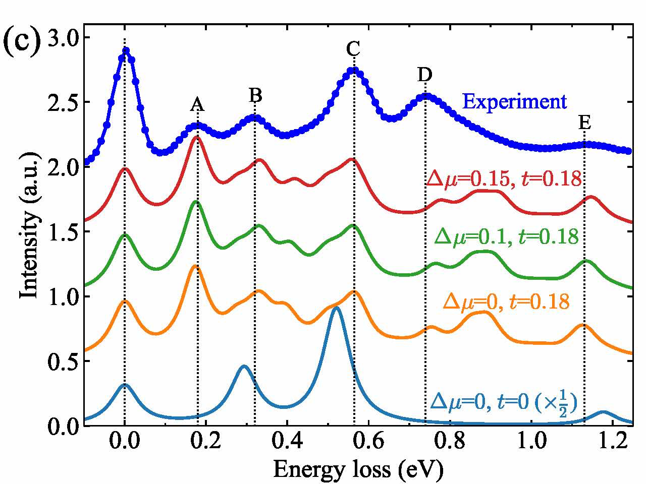 Experimental observation of the excitations of delocalized dimer orbitals in RIXS spectrum, compared with the theoretical calculations. (a): orbital energy level analyses with electron hopping forbidden (red), and electron hoping allowed (blue). (b): calculated evolution of the excitation as a function of hopping energy t from 0 to 200 meV. (c): The simulated RIXS spectrum with several chosen parameter sets, compared to the experimental results.