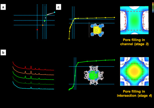 Figure 2. (a) Overall Ar adsorption isotherm of PCN-224 at 87 K (b) X-ray diffraction profiles of PCN-224 at different Ar pressures. (c) Sub-isotherms of channel and intersection of PCN-224 with electron density maps of Ar in each pore during capillary condensation.