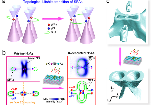 In their work, using in-situ surface (potassium) decoration, an international collaboration of researchers from ShanghaiTech University, Oxford University, Tsinghua University, Max Planck Institute for Chemical Physics of Solids, Princeton University, and Weizmann Institute of Science demonstrated a successful manipulation of the shape, size and even the connections of SFAs in a model TWS (NbAs), and observed their evolution leading to an unusual topological Lifshitz transition using angle-resolved photoemission spectroscopy (ARPES). The phase transition “teleports” the SFAs between different parts of the surface Brillouin zone, and despite the dramatic surface evolution, the existence of SFAs is robust and each SFA remains tied to a pair of Weyl points of opposite chirality, as dictated by the bulk topology. This method of controlling and manipulating the topological electronic states of TWSs in this work will not only open a new frontier for the exploration of fundamental physical phenomena, but also make possible the design of unusual electronic applications mediated by SFAs.