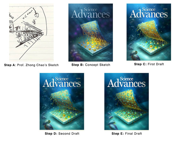Professor Zhong Chao from School of Material Science and Technology asked me to make a cover for his research on underwater adhesive fibrous coatings. His idea was to show the adhesion of two substrates, where the upper surface is coated by nanofibers and the lower surface is coated by protein droplets. I spent one month on it. This one required two revision stages, I think we went through three drafts. I don't think I was working on other images at the time, so I could focus on this one.