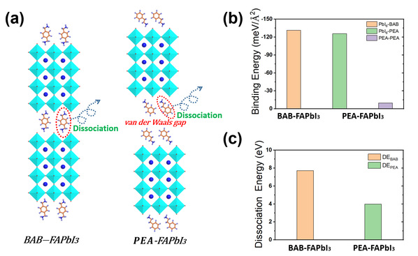 In this work, Ning Zhijun’s group applied a new bidentate organic molecule named 1,4-Bis(aminomethyl)benzene (BAB), which weds the inorganic layers with chemical bond, forming a Dion-Jacobson (DJ) structure. The traditional organic molecule meanwhile, like phenylethylamine (PEA), forming a Ruddlesden-Popper (R-P) structure, connects the inorganic layers with van der waals force. Through first principles calculation, they proved that both binding energy between the layered structures and molecule dissociation energy of DJ structure are much higher than RP structure (Figure 1). What’s more, the application of BAB reduces the ratio of dielectric organic molecules in perovskites, leading a higher current injection efficiency and this helps lower the joule heat in devices while working.