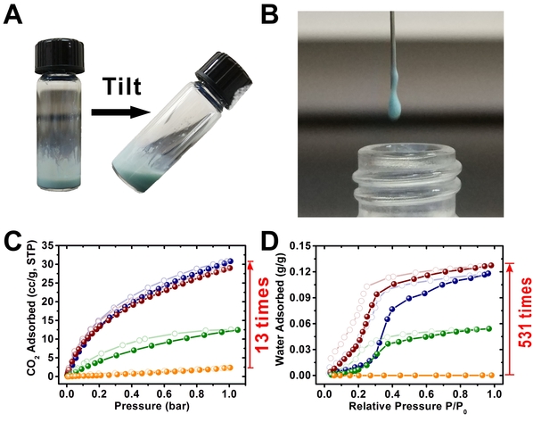 Liquid sorbents, such as water, polyethylene glycol (PEG), and organic amine solutions, are widely used in many industrial processes for acid gases removal. This process is called wet scrubbing. However, most liquid sorbents have high vapor pressure and are sometimes even corrosive to the equipment. These undesirable features greatly increase the cost of separation and complicate facility design. In contrast, solid adsorbents are non-corrosive and have no vapor pressure. They exhibit sorption behaviors far richer than their liquid counterparts due to the presence of permanent pores. One representative class of porous materials is metal organic frameworks (MOFs). However, conventional knowledge tells us that permanent porosity only exists in solid materials, meaning solid sorbents cannot flow and liquid sorbent materials cannot have permanent porosity. Recently, Li Tao 's research group used a new surface modification technique to achieve stable MOF particle suspension in a bulk polymeric solvent, polydimethylsiloxane (PDMS). The resultant materials, namely porous liquids (PLs), flow like liquids but at the same time, possess all the permanent porosity from the MOFs. These PLs combines the merits of both solid and liquid sorbents, which offer new insights for industrial gas separation. The work, “General Way To Construct Micro- and Mesoporous Metal–Organic Framework-Based Porous Liquids”, was published in Journal of the American Chemical Society.