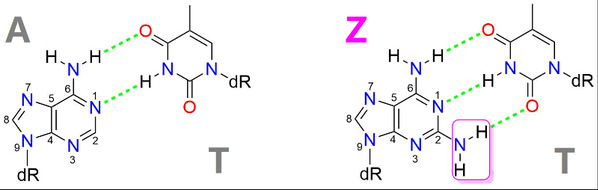 Figure 1. Z-T base pair has three hydrogen bonds, while A-T base pair only has two.