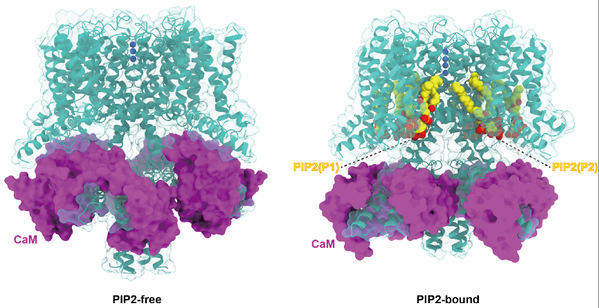 It is known that the channel opening of all KCNQs relies on the signaling lipid molecule PIP2. However, the molecular mechanism of PIP2 in modulating the opening of the four neuronal KCNQ channels (KCNQ2-5), which are essential for regulating neuronal excitability, remains largely elusive. Researchers purified the human KCNQ4 protein and assembled it with PIP2-containing nanodisc to present the target protein in a near-to-native membrane environment. Structural analysis and comparison with the closed-state structure in the absence of PIP2 (also reported in this study) revealed an open conformation of the channel. This is the first report of the open-state structure of a neuronal KCNQ channel thus providing new insight into the field. It is worth mentioning that the structure provides the first-hand validation of this hypothesis, despite a number of biochemical and computational studies in the past that have predicted two potential PIP2 binding sites. Comparing it with the structure of KCNQ4 in the absence of PIP2, the researchers found that binding of PIP2 results in large-scale structural rearrangements occurring in the cytosolic domain and CaM. Moreover, the two PIP2 molecules modulate in a synergistic way in the electromechanical coupling of voltage-sensing domain (VSD) and pore domain (PD) to open the channel. Sequence alignment with other KCNQ channels showed that the two PIP2 binding sites are absolutely conserved, implying a similar modulating mechanism for other KCNQ channels. This study elucidated the molecular mechanism of PIP2 regulating the opening of the KCNQ family of channels, provided new opportunity for drug discovery targeting KCNQ channels, and laid a scientific foundation for the clinical transformation of deafness and other neurological diseases.