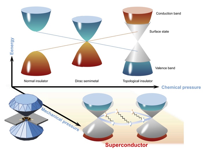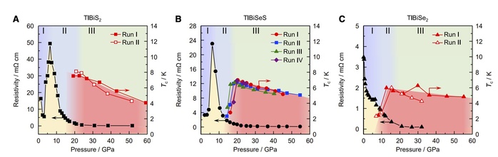 Recently, a joint research team applied hydrostatic pressure to the thallium-based materials TlBi(S1−xSex)2 and investigated the effects of chemical and mechanical pressures on the phase transition and superconductivity induced by high pressure in three thallium-based materials, covering the phase transition from a normal insulator (TlBiS2) to a topological insulator (TlBiSe2) through a Dirac semimetal (TlBiSeS). By increasing the pressure up to 60GPa, the researchers observe superconductivity phase diagrams with maximal critical temperature (Tc) values at 6.0~8.1K. The researchers also formulated density-functional theory calculations that revealed topological surface states in superconductivity phases for all three compounds. This work paved the path to explore topological superconductivity and topological phase transitions.