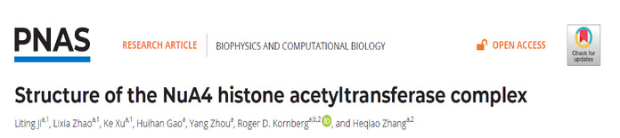 Recently, a group led by Distinguished Adjunct Professor Roger Kornberg and Research Associate Professor Zhang Heqiao of the laboratory of structure biochemistry at SIAIS, published a paper entitled “Structure of the NuA4 histone acetyltransferase complex” in the Proceedings of the National Academy of the Sciences (PNAS), reporting a near-atomic resolution structure of the NuA4 complex in eukaryotes obtained by cryo-electron microscopy (cryo-EM).
