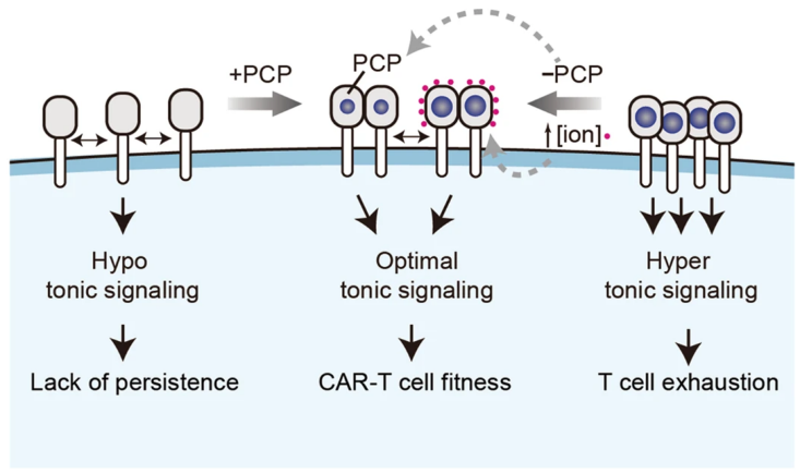 In this study, researchers revealed that electrostatic interactions mediated by positively charged patches (PCP) on the CAR surface drive tonic signaling (Figure 1). Most CAR-T cells targeting solid tumors tend to become exhausted due to the high tonic signaling intensity. However the tonic signaling of solid tumor CAR-T cells could be attenuated by increasing the ionic strength during the culture or shrinking the PCP. Conversely, some CAR-T cells targeting blood cancersmay have poor persistence due to insufficient tonic signal intensity, such as CD19 and CD22 CARs, while the tonic signal of such CAR-T cells can be enhanced by increasing the PCP to improve their in vivo persistence.