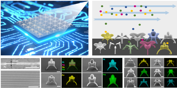 Powering next-generation of nanoelectronics and nanophotonics with the key abilities to print multiple materials of high precision. The scale bar is 1 μm, unless otherwise specified.