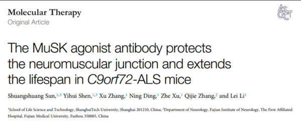 Assistant Professor Li Lei’s group in the School of Life Science and Technology (SLST) has been dedicated to exploring the pathological mechanisms of neurodegenerative diseases. In their recent study, the researchers revealed a new mechanism of neuromuscular junction deficits in ALS and discovered a novel therapeutic strategy. The results were published in a paper entitled “The MuSK agonist antibody protects the neuromuscular junction and extends the lifespan in C9orf72-ALS mice” in the journal Molecular Therapy in May.
