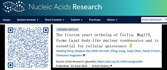 Recently, the team led by Assistant Professor Tomoyasu Sugiyama at the School of Life Science and Technology (SLST), ShanghaiTech University, has identified the ortholog of Coilin, Mug174, an integral constituent of CBs, in the fission yeast Schizosaccharomyces pombe (S. pombe) and has unveiled novel roles of Coilin/CBs in G0/cellular quiescence. The study was published in a paper titled “The fission yeast ortholog of Coilin, Mug174, forms Cajal body-like nuclear condensates and is essential for cellular quiescence,” in the journal Nucleic Acids Research.