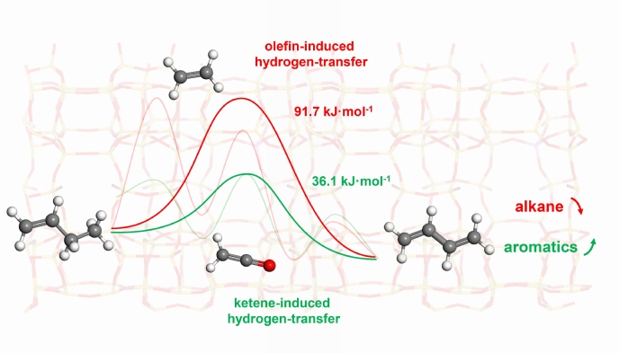 Drawing on experimental observations of surface acetyl species and the pronounced reduction in alkane selectivity under a CO atmosphere, the researchers proposed a ketene-induced hydrogen-transfer mechanism, a new mechanism that may compete with OHT. Through AIMD simulations and free energy sampling including metadynamics and slow-growth, they modeled the free energy surfaces (FES) for reactions where ethylene and ketene/acetyl cations serve as hydride acceptors in the conversion of butylene to butadiene. The results revealed that the ketene/acetyl cation-mediated pathway has an effective free energy barrier of just 36.1 kJ/mol, significantly lower than the 91.7 kJ/mol barrier for the ethylene-induced OHT route. This indicates that ketene/acetyl cations are more effective hydride receptors than olefins, enabling a route that increases olefin unsaturation without generating additional alkanes. Moreover, the resulting butadiene and acetaldehyde can further participate in cyclization reactions, boosting aromatic formation.